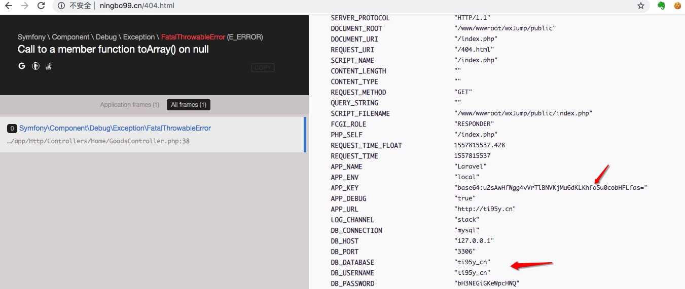 准备验证下和Github上的源码是否一致,随便挑了个文件进行访问,继续报错,这次的错误信息中爆出了服务器的环境信息,包含MySQL的账号密码等信息。